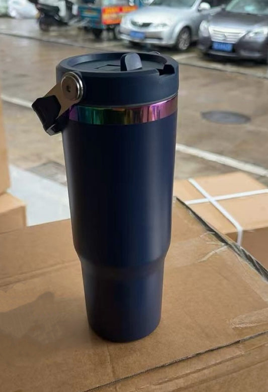 Navy Blue Powder Coated Rainbow Underneath 30oz Flip Straw Water Bottle For Laser Engraved_miki