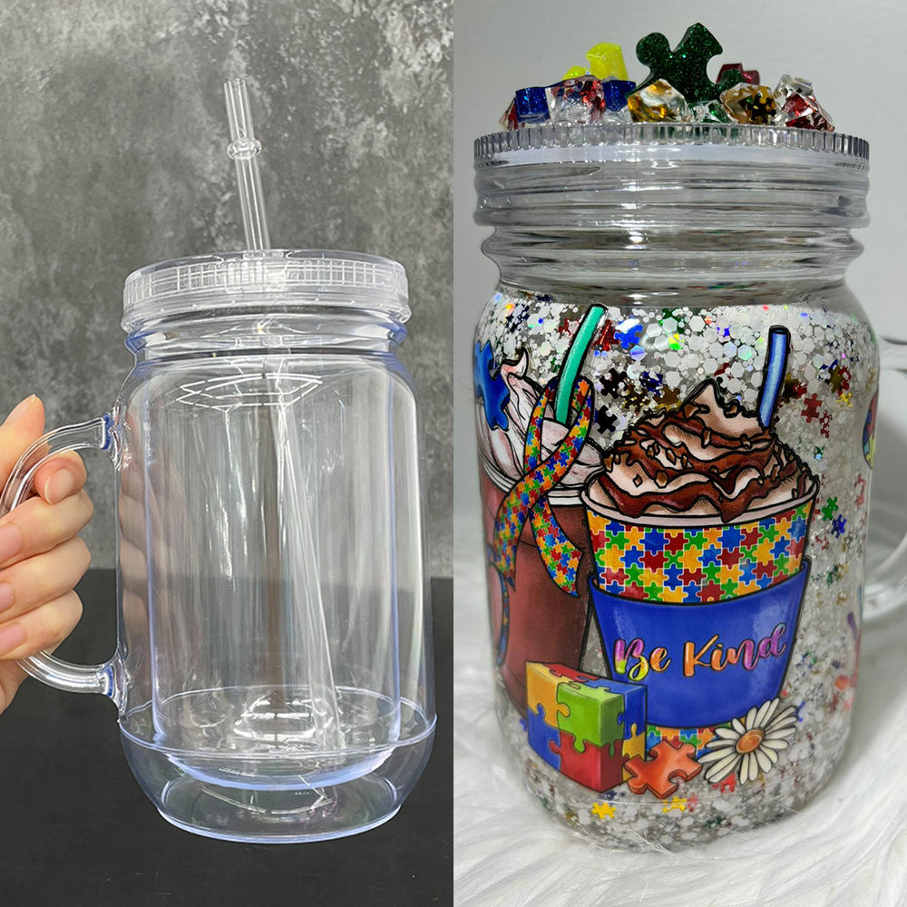 Acrylic Plastic 20oz Double Wall Snow Globe Mason Jar with Handle, Lid and Straw for DIY Glitter and Vinyl_ miki